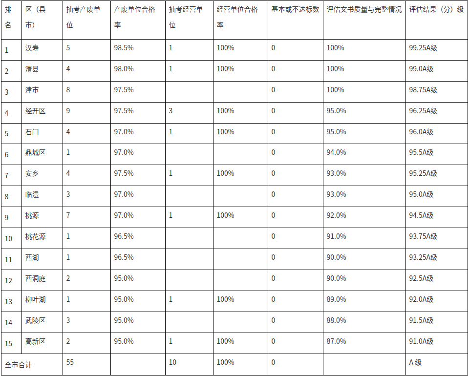 对各区(县市)的评估工作资料、产废单位和经营单位现场抽查考核情况、区(县市)危险废物规范化管理督查考核工作评级指标审核情况综合评估,15个区县评估结果均为A级(得分、排名见附件)。