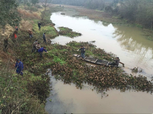图为2016年1月13日上午,鼎城区灌溪镇人工打捞水葫芦现场