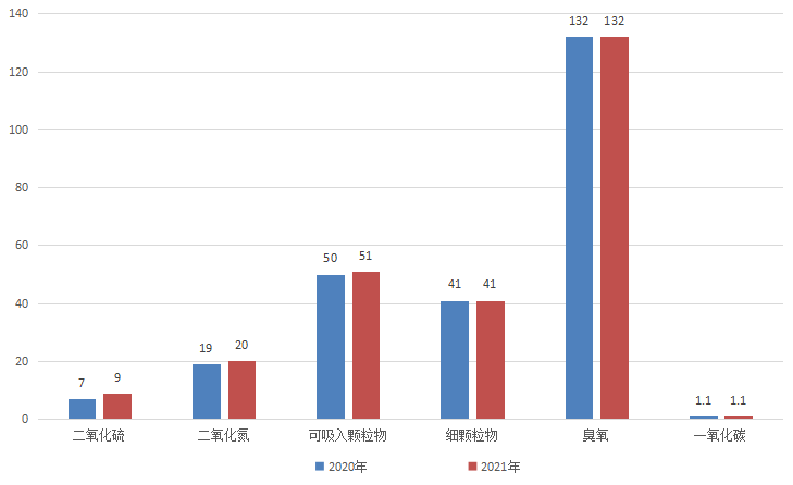 2021年常德市城市环境空气质量有效监测天数365天,环境空气质量优良天数为312天、污染天数为53天,环境空气质量优良率为85.5%。同比2020年优良天数增加2天,环境空气质量优良率提高0.8个百分点。2021年常德城区二氧化硫、二氧化氮、可吸入颗粒物、细颗粒物、臭氧、一氧化碳的年均浓度分别为9ug/m3、20ug/m3、51ug/m3、41ug/m3、132ug/m3、1.1mg/m3。细颗粒物年均浓度未达到《环境空气质量标准》(GB3095-2012)污染物浓度限值的二级标准,二氧化硫、二氧化氮、可吸入颗粒物年均浓度均符合《环境空气质量标准》(GB3095-2012)污染物浓度限值的二级标准;同比2020年,细颗粒物、臭氧、一氧化碳的年均浓度持平,二氧化硫、二氧化氮、可吸入颗粒物的年均浓度均有不同程度的上升,分别上升2ug/m3、1ug/m3、1ug/m3。见图1