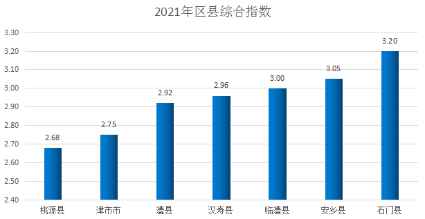 2021年,7个县市的环境空气质量优良率由高到低依次为津市市(96.4%)、汉寿县(96.2%)、临澧县(95.9%)、桃源县(95.3%)、澧县(94.5%)、安乡县(93.7%)、石门县(93.4%);年综合指数在2.68~3.20之间,排名从好到差依次为桃源县、津市市、澧县、汉寿县、临澧县、安乡县、石门县。见图3