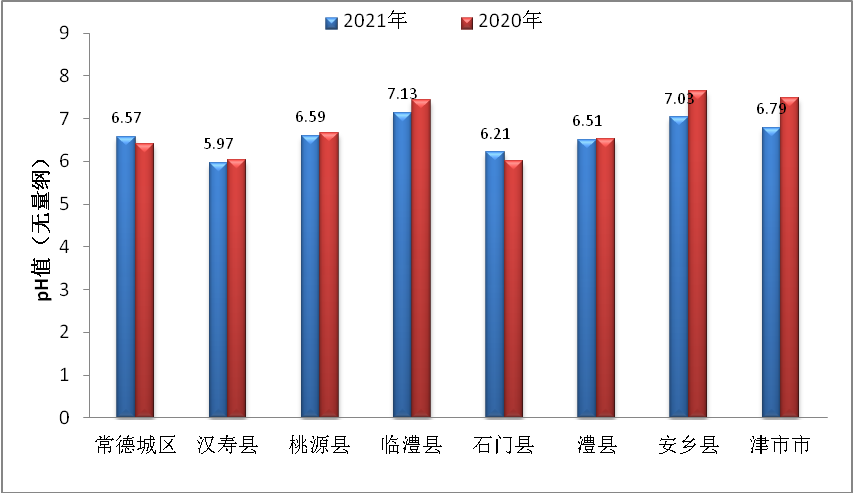 2021年,汉寿县、桃源县、临澧县、澧县、安乡县、津市市无酸雨,石门县酸雨频率为1.1%。7个县市降水pH年均值在5.97~7.13之间,汉寿县降水pH年均值最低,临澧县降水pH年均值最高。同比2020年,石门县降水pH年均值有所下降, 汉寿县、桃源县、临澧县、澧县、安乡县、津市市降水pH年均值有所上升。见表2、图4